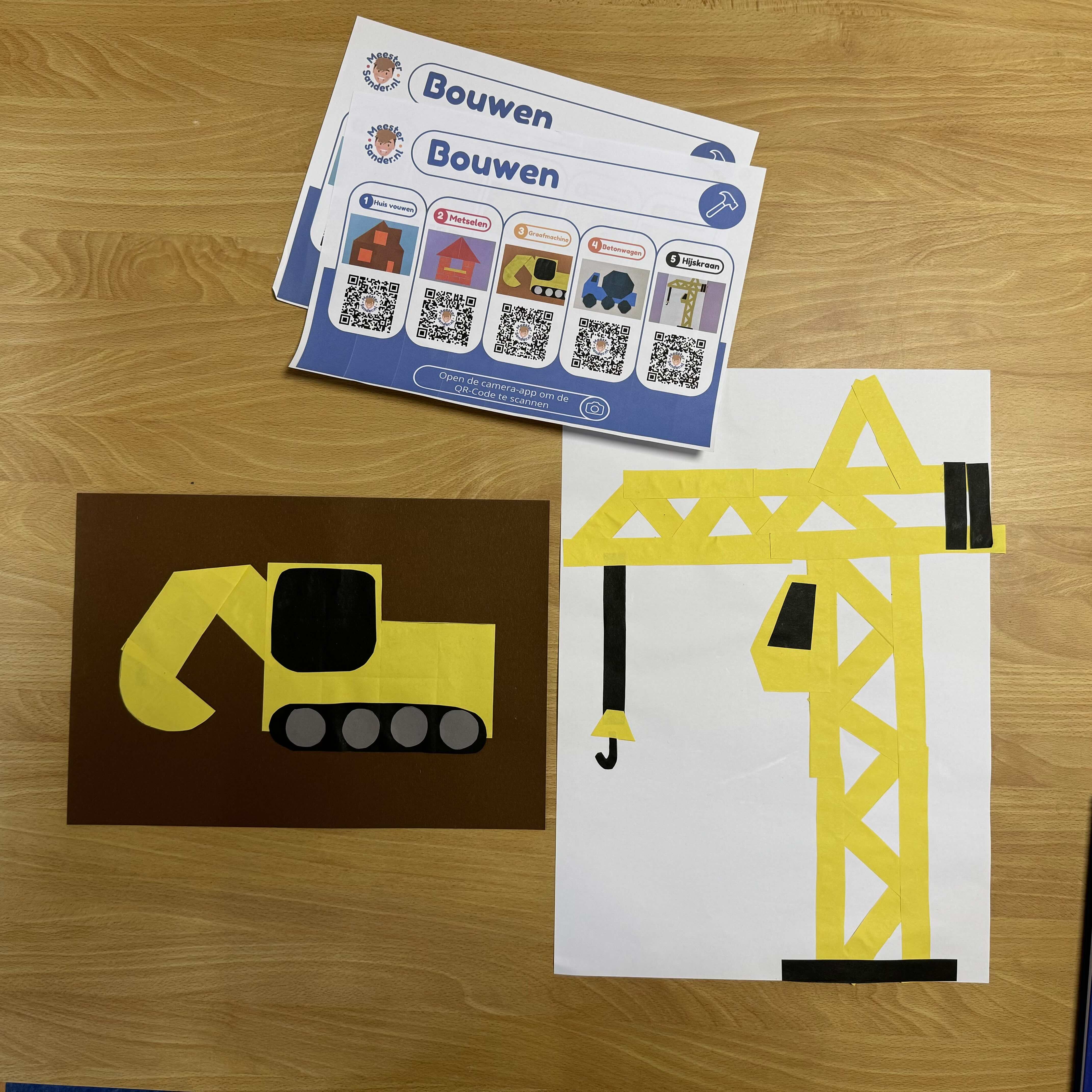 Ook voor dit thema moest er natuurlijk een instructiemuur komen. Met de instructiemuur kunnen de kinderen de QR code scannen en ze krijgen direct een filmpje te zien(zonder reclame) over de knutsel. Zo heb ik voor dit thema een huis, graafmachine, betonwagen en hijskraan gevouwen en geknutseld.